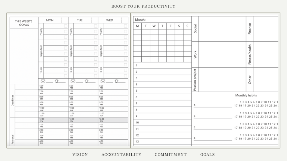 I designed the planner based on a decade of purchasing diaries that failed to scaffold productivity and promote efficient working. This planner has over 150 pages and is supported by the pyramid goal theory.